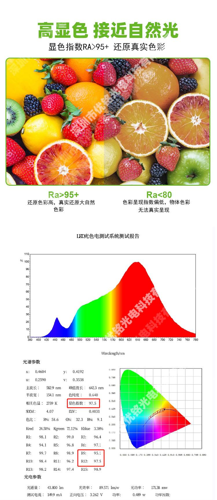 6、灯珠显指:RA>80/90/95/97全光谱均有